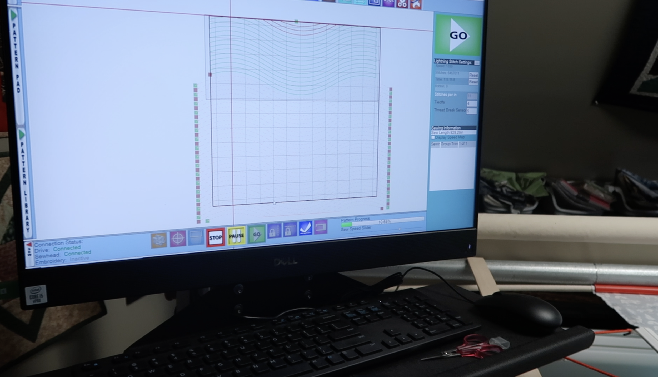 Our Innova longarm quilting machine does most of the work for us! We load up the machine with your quilt and thread, select the appropriate pattern, and set it off to go. Don’t worry - the machine is never alone; we are always nearby to keep an eye on its progress! Once everything is quilted, we make any necessary trimming, and finalize any packing to return your quilt home to you!